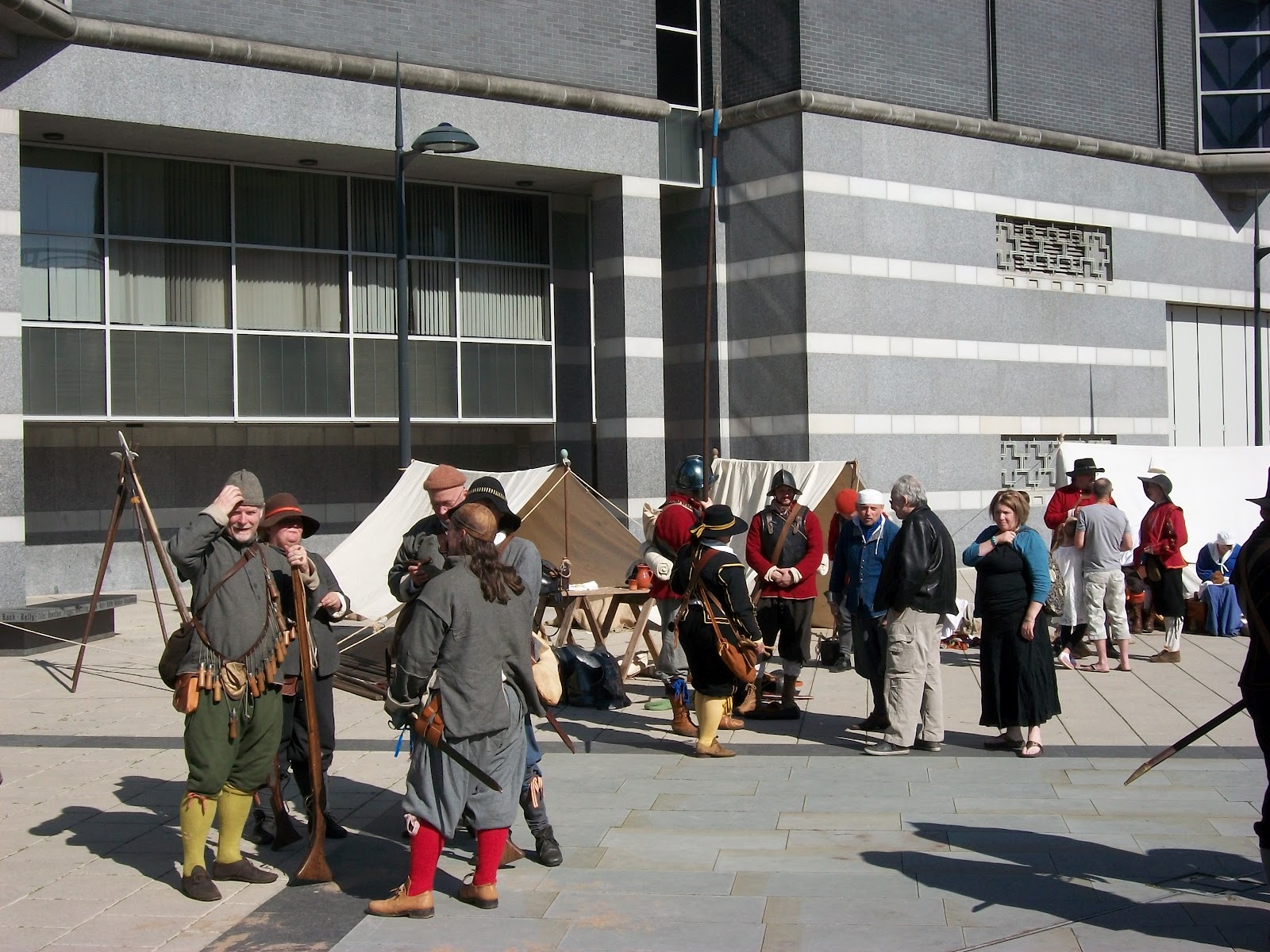 After that disappointment, what a delightful surprise when I pressed on the armory. In the plaza outside the entrance, a group from the Civil War Society--their civil war not ours--had set up shop and were demonstrating the life of Cavaliers and Roundheads in the 1640s when Charles I tried to assert his "divine right" to rule and got handed his head, literally. Never a popular king or particularly accomplished, he did, however, mount the scaffold with great dignity, and it was said later that nothing in his life became him so much as his losing it. A couple of pix of their layout.